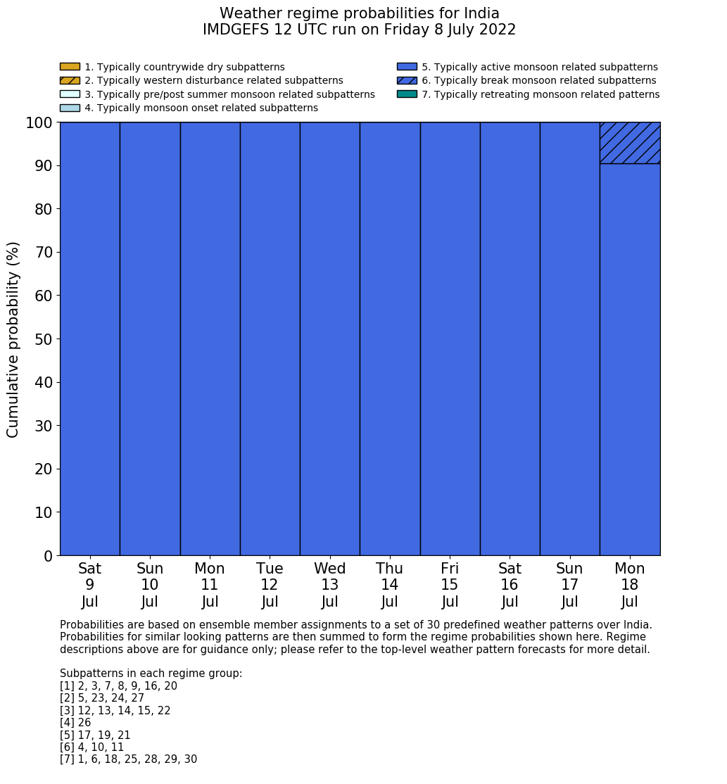 | Weather patterns typically associated with summer monsoon tendencies over India are most likely Weather patterns 12, 13, 15, 15 and 22 (pre/post summer monsoon); 26 (onset); 17, 19 and 21 (active); 4, 10 and 11 (break) | |