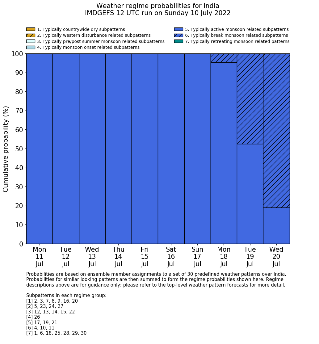 | Weather patterns typically associated with summer monsoon tendencies over India are most likely Weather patterns 12, 13, 15, 15 and 22 (pre/post summer monsoon); 26 (onset); 17, 19 and 21 (active); 4, 10 and 11 (break) | |