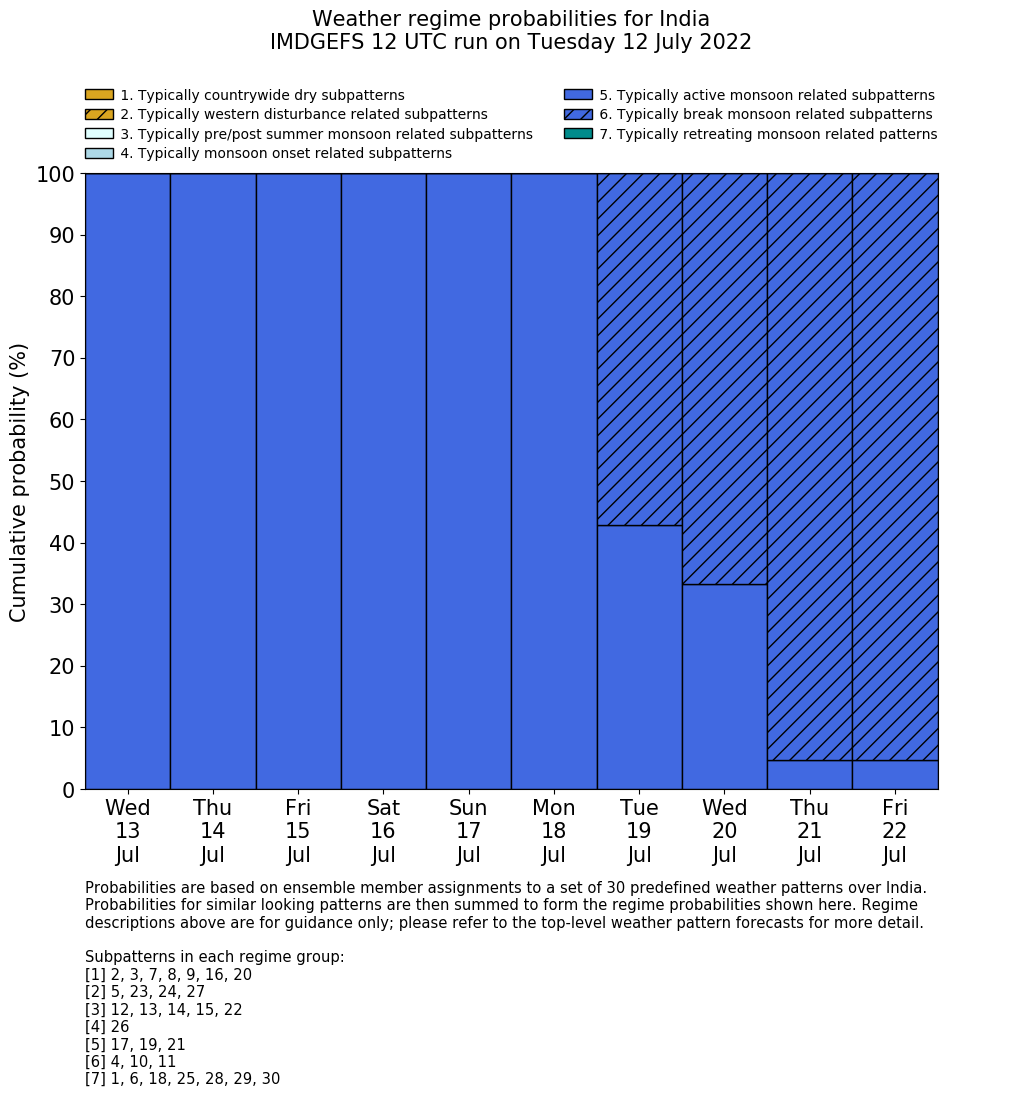 | Weather patterns typically associated with summer monsoon tendencies over India are most likely Weather patterns 12, 13, 15, 15 and 22 (pre/post summer monsoon); 26 (onset); 17, 19 and 21 (active); 4, 10 and 11 (break) | |