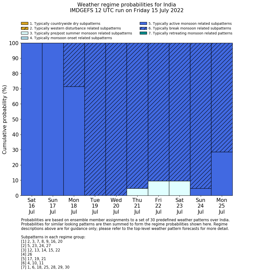 | Weather patterns typically associated with summer monsoon tendencies over India are most likely Weather patterns 12, 13, 15, 15 and 22 (pre/post summer monsoon); 26 (onset); 17, 19 and 21 (active); 4, 10 and 11 (break) | |