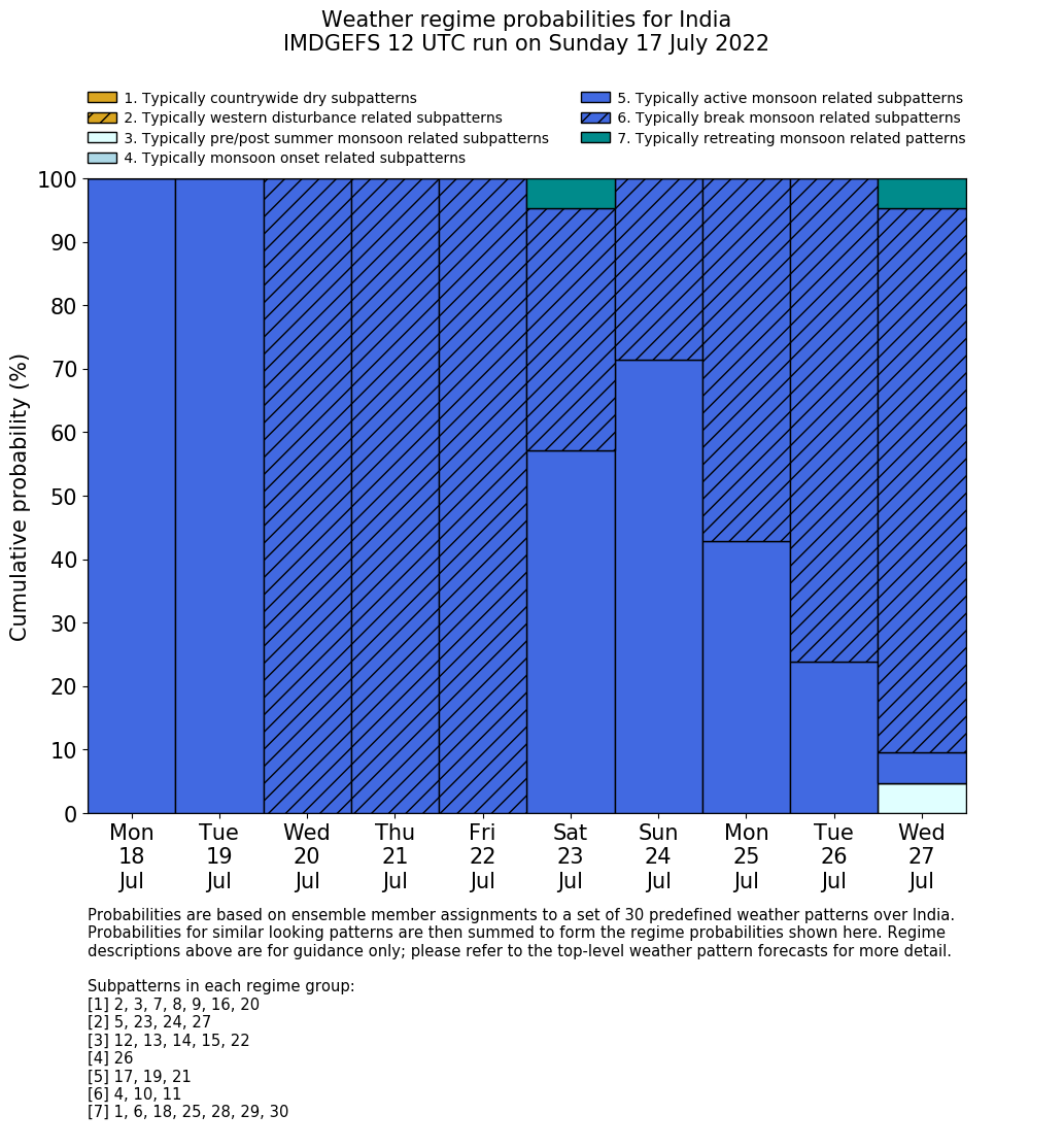| Weather patterns typically associated with summer monsoon tendencies over India are most likely Weather patterns 12, 13, 15, 15 and 22 (pre/post summer monsoon); 26 (onset); 17, 19 and 21 (active); 4, 10 and 11 (break) | |