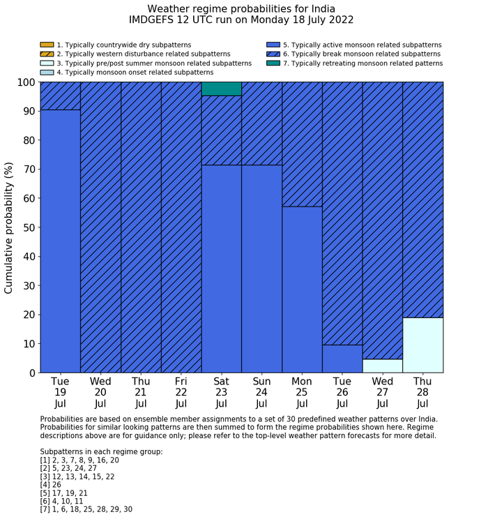 | Weather patterns typically associated with summer monsoon tendencies over India are most likely Weather patterns 12, 13, 15, 15 and 22 (pre/post summer monsoon); 26 (onset); 17, 19 and 21 (active); 4, 10 and 11 (break) | |