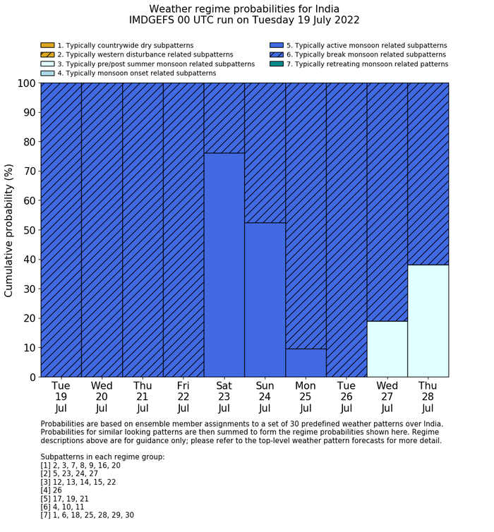 | Weather patterns typically associated with active monsoon tendencies over India are most likely Weather patterns 17, 19 and 21 (active) |