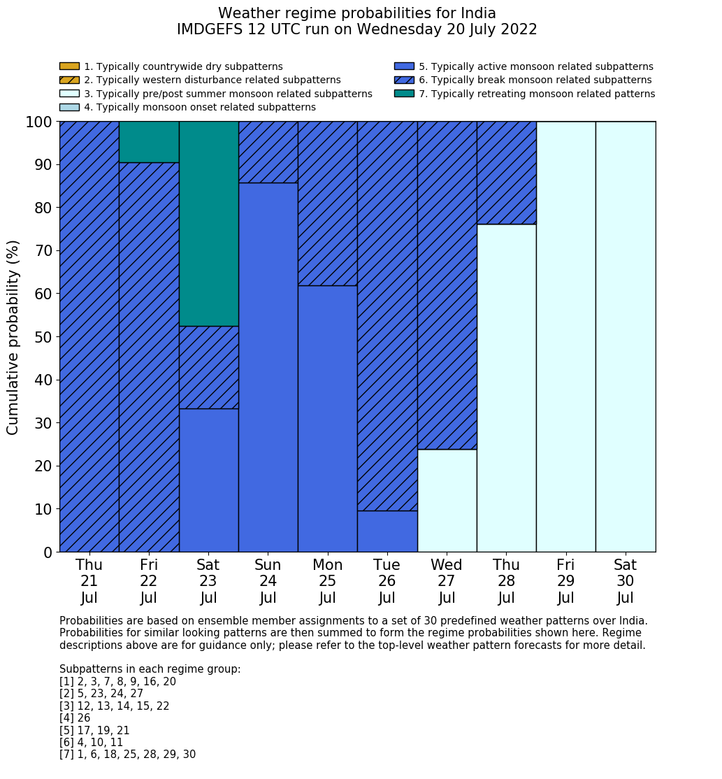 | Weather patterns typically associated with summer monsoon tendencies over India are most likely Weather patterns 12, 13, 15, 15 and 22 (pre/post summer monsoon); 26 (onset); 17, 19 and 21 (active); 4, 10 and 11 (break) | |
