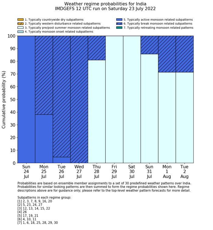 | Weather patterns typically associated with summer monsoon tendencies over India are most likely Weather patterns 12, 13, 15, 15 and 22 (pre/post summer monsoon); 26 (onset); 17, 19 and 21 (active); 4, 10 and 11 (break) | |
