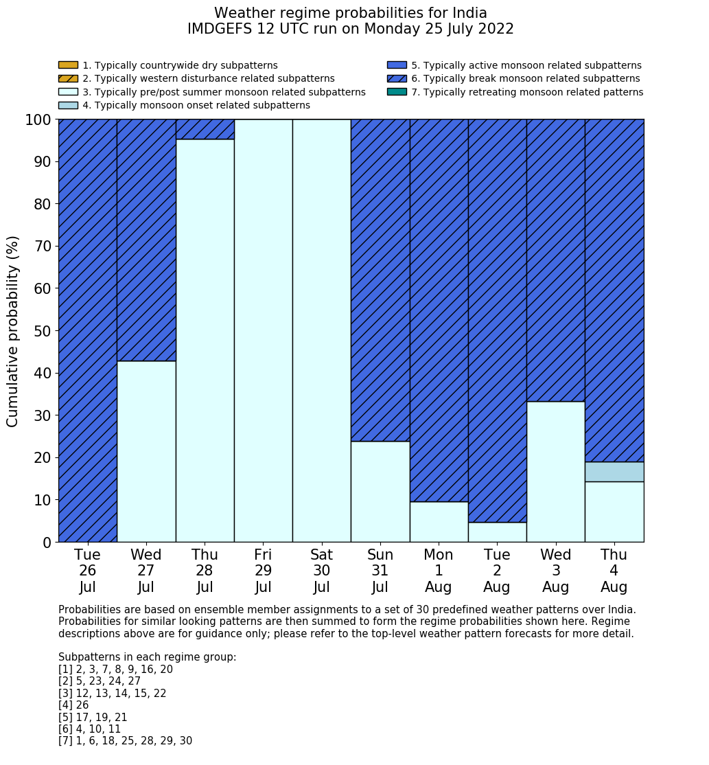 | Weather patterns typically associated with summer monsoon tendencies over India are most likely Weather patterns 12, 13, 15, 15 and 22 (pre/post summer monsoon); 26 (onset); 17, 19 and 21 (active); 4, 10 and 11 (break) | |
