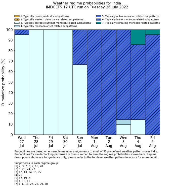 | Weather patterns typically associated with summer monsoon tendencies over India are most likely Weather patterns 12, 13, 15, 15 and 22 (pre/post summer monsoon); 26 (onset); 17, 19 and 21 (active); 4, 10 and 11 (break) | |