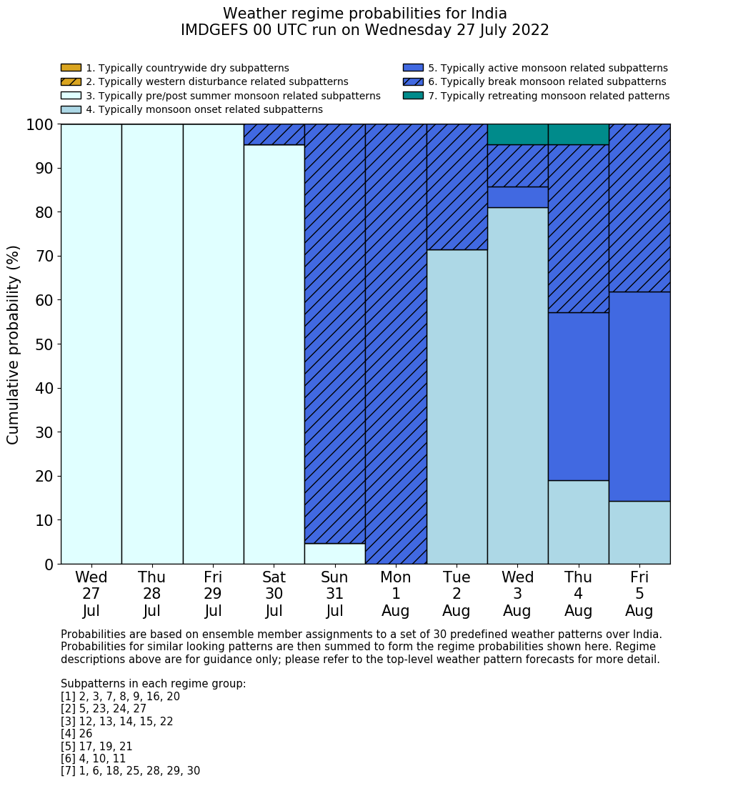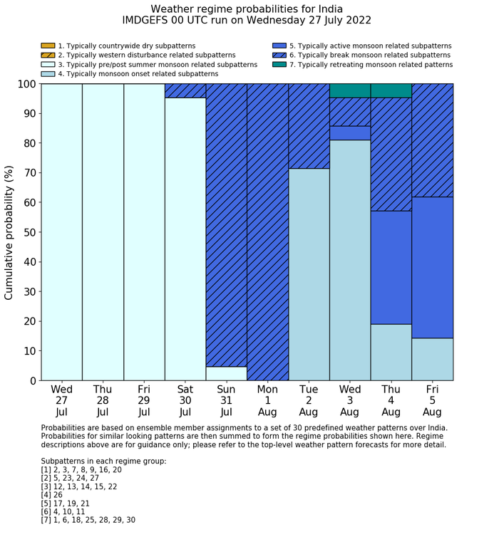 | Weather patterns typically associated with summer monsoon tendencies over India are most likely Weather patterns 12, 13, 15, 15 and 22 (pre/post summer monsoon); 26 (onset); 17, 19 and 21 (active); 4, 10 and 11 (break) | |