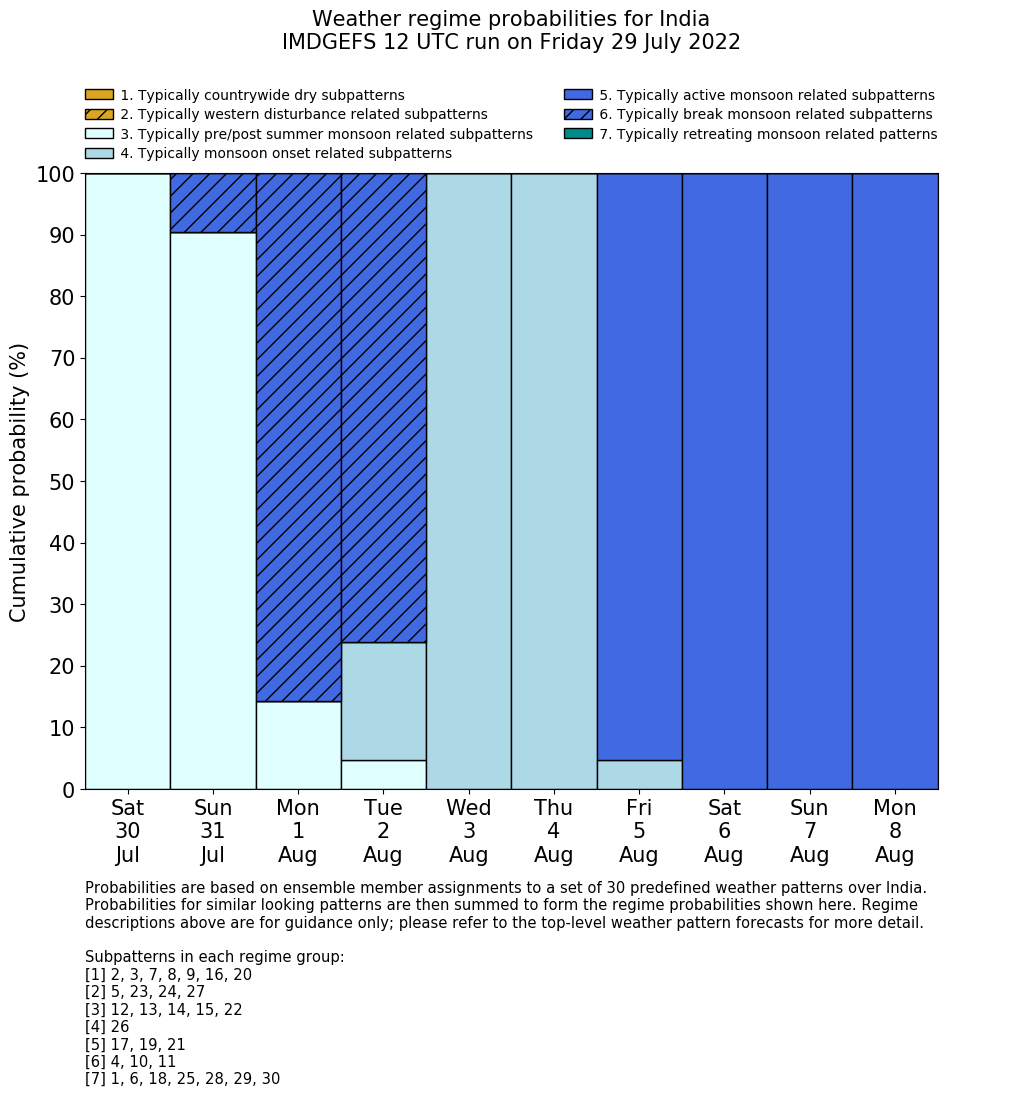 | Weather patterns typically associated with summer monsoon tendencies over India are most likely Weather patterns 12, 13, 15, 15 and 22 (pre/post summer monsoon); 26 (onset); 17, 19 and 21 (active); 4, 10 and 11 (break) | |
