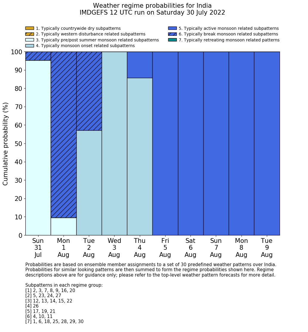 | Weather patterns typically associated with summer monsoon tendencies over India are most likely Weather patterns 12, 13, 15, 15 and 22 (pre/post summer monsoon); 26 (onset); 17, 19 and 21 (active); 4, 10 and 11 (break) | |