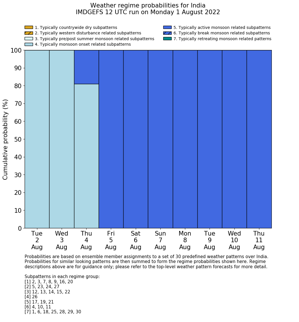 | Weather patterns typically associated with summer monsoon tendencies over India are most likely Weather patterns 12, 13, 15, 15 and 22 (pre/post summer monsoon); 26 (onset); 17, 19 and 21 (active); 4, 10 and 11 (break) | |