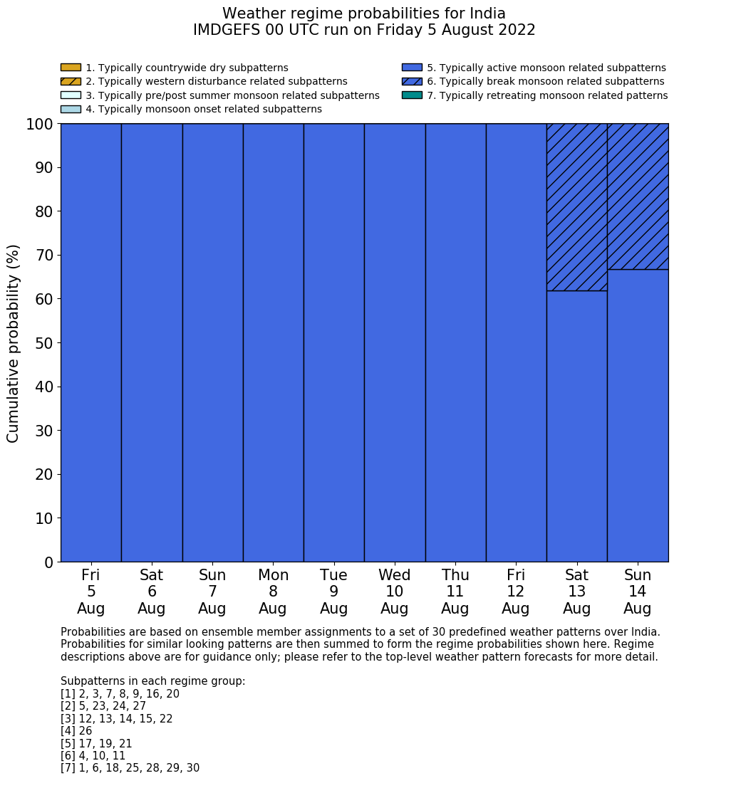 | Weather patterns typically associated with summer monsoon tendencies over India are most likely Weather patterns 12, 13, 15, 15 and 22 (pre/post summer monsoon); 26 (onset); 17, 19 and 21 (active); 4, 10 and 11 (break) | |