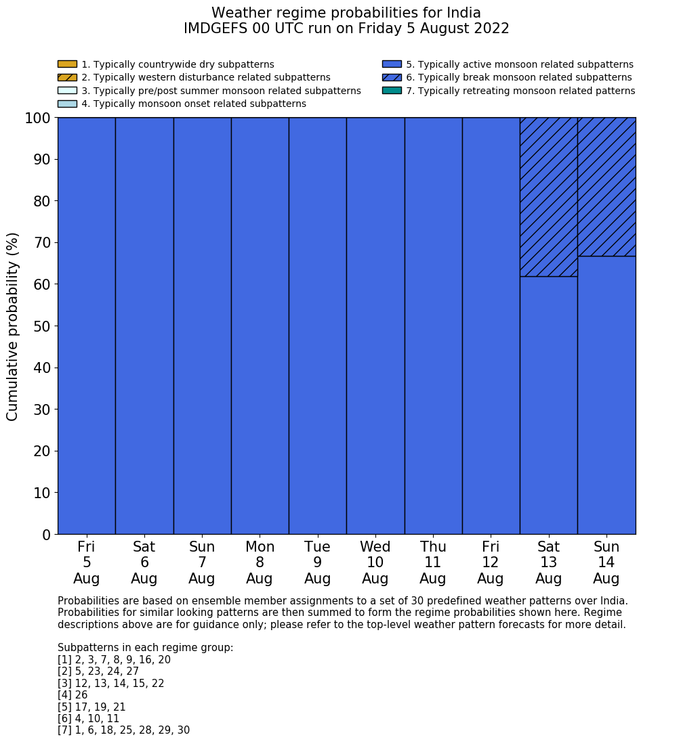 | Weather patterns typically associated with contrywide dry period tendencies over India are most likely Weather patterns 2, 3, 7, 8, 9, 16 and 20 (countrywide winter dry period) | |