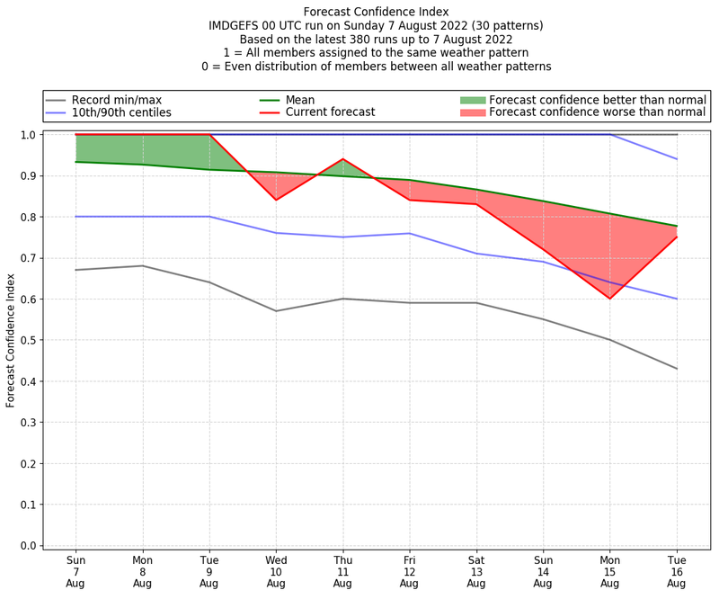 | Weather patterns typically associated with contrywide dry period tendencies over India are most likely Weather patterns 2, 3, 7, 8, 9, 16 and 20 (countrywide winter dry period) | |