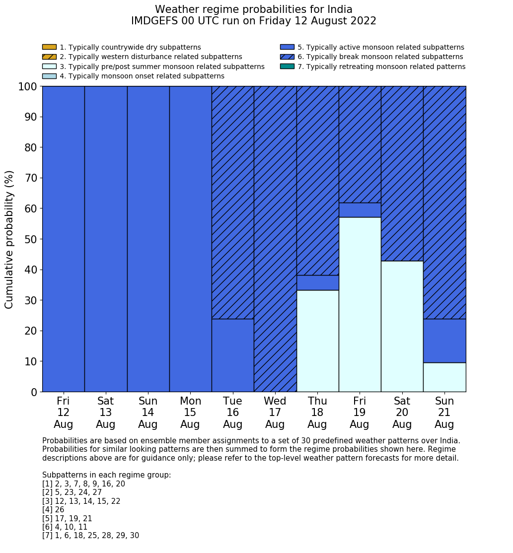 | Weather patterns typically associated with summer monsoon tendencies over India are most likely Weather patterns 12, 13, 15, 15 and 22 (pre/post summer monsoon); 26 (onset); 17, 19 and 21 (active); 4, 10 and 11 (break) | |