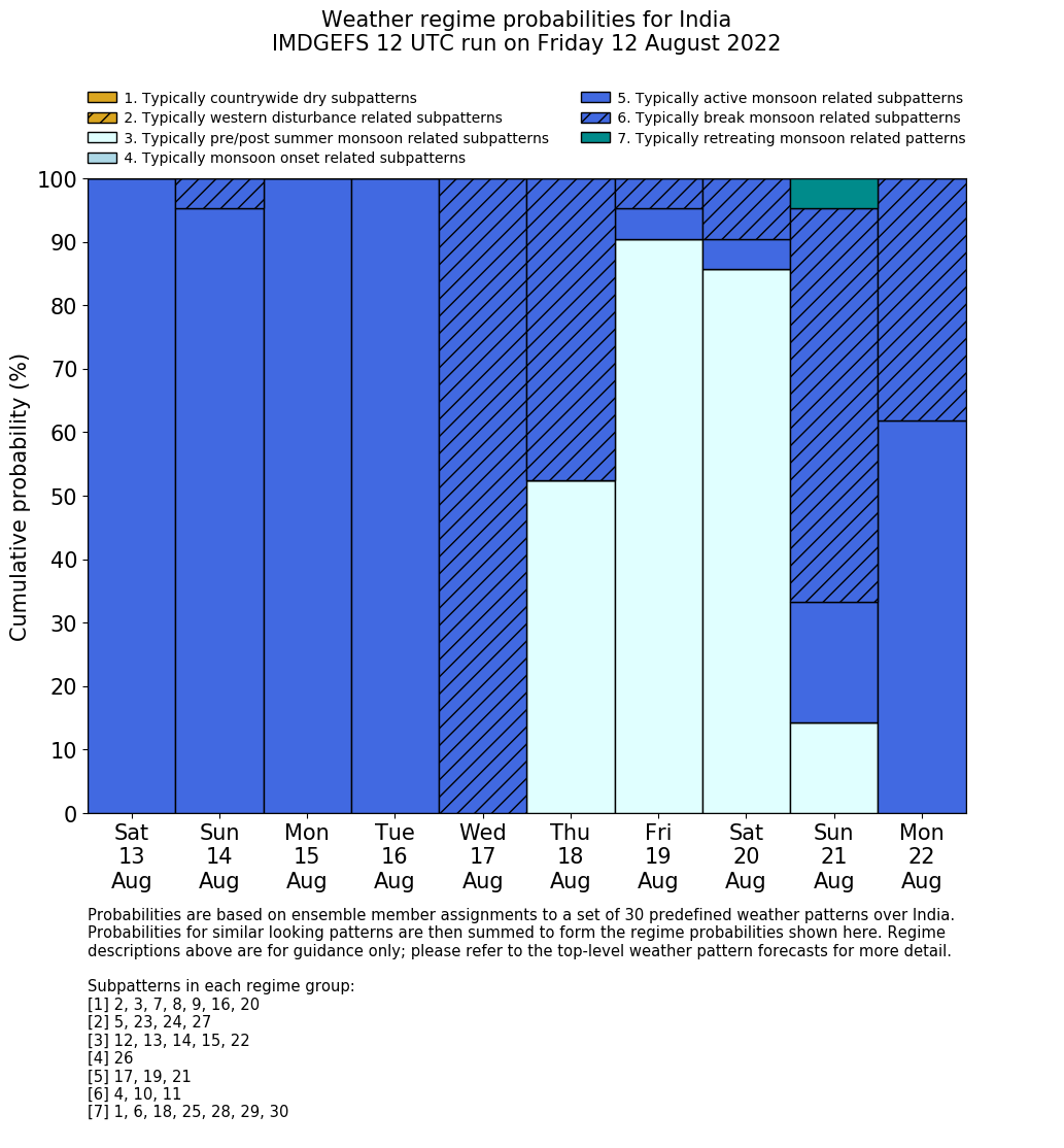 | Weather patterns typically associated with summer monsoon tendencies over India are most likely Weather patterns 12, 13, 15, 15 and 22 (pre/post summer monsoon); 26 (onset); 17, 19 and 21 (active); 4, 10 and 11 (break) | |