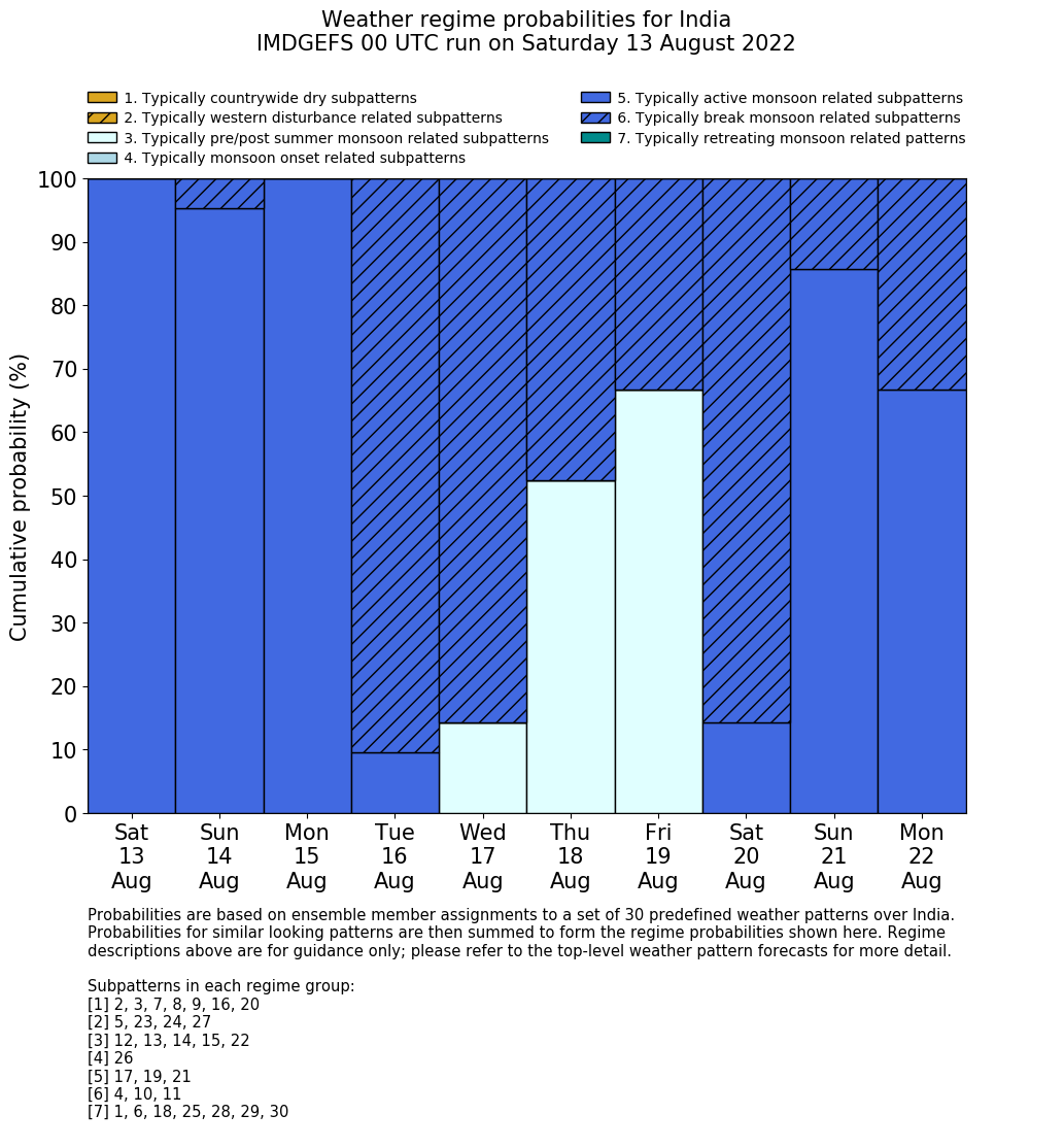 | Weather patterns typically associated with summer monsoon tendencies over India are most likely Weather patterns 12, 13, 15, 15 and 22 (pre/post summer monsoon); 26 (onset); 17, 19 and 21 (active); 4, 10 and 11 (break) | |