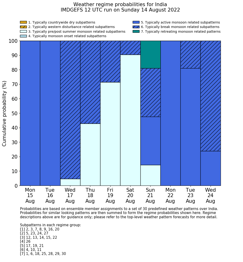 | Weather patterns typically associated with summer monsoon tendencies over India are most likely Weather patterns 12, 13, 15, 15 and 22 (pre/post summer monsoon); 26 (onset); 17, 19 and 21 (active); 4, 10 and 11 (break) | |