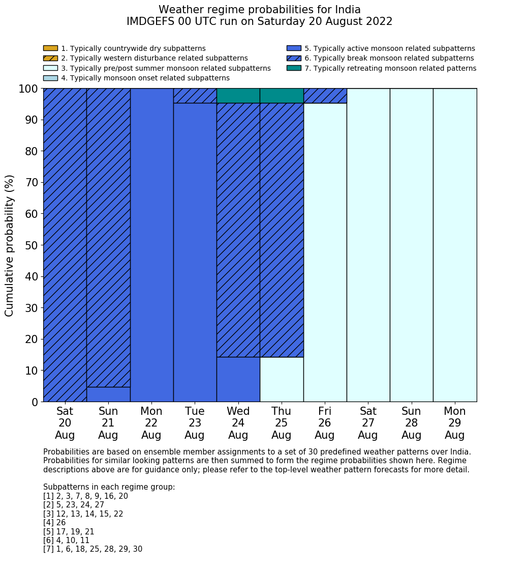 | Weather patterns typically associated with summer monsoon tendencies over India are most likely Weather patterns 12, 13, 15, 15 and 22 (pre/post summer monsoon); 26 (onset); 17, 19 and 21 (active); 4, 10 and 11 (break) | |