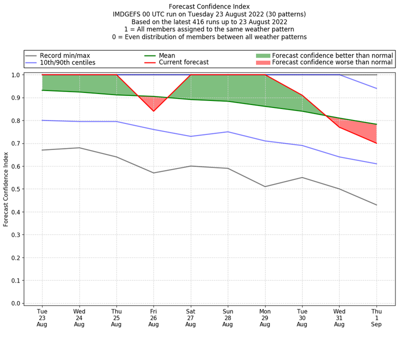 | Weather patterns typically associated with contrywide dry period tendencies over India are most likely Weather patterns 2, 3, 7, 8, 9, 16 and 20 (countrywide winter dry period) | |