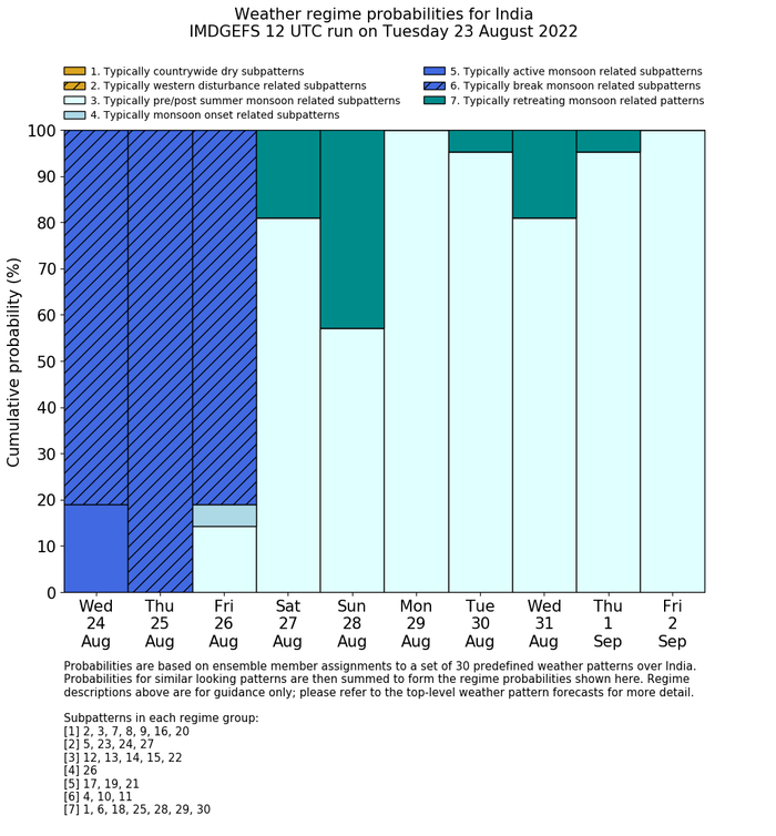 | Weather patterns typically associated with contrywide dry period tendencies over India are most likely Weather patterns 2, 3, 7, 8, 9, 16 and 20 (countrywide winter dry period) | |