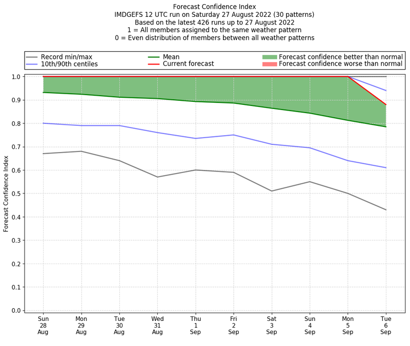 | Weather patterns typically associated with contrywide dry period tendencies over India are most likely Weather patterns 2, 3, 7, 8, 9, 16 and 20 (countrywide winter dry period) | |