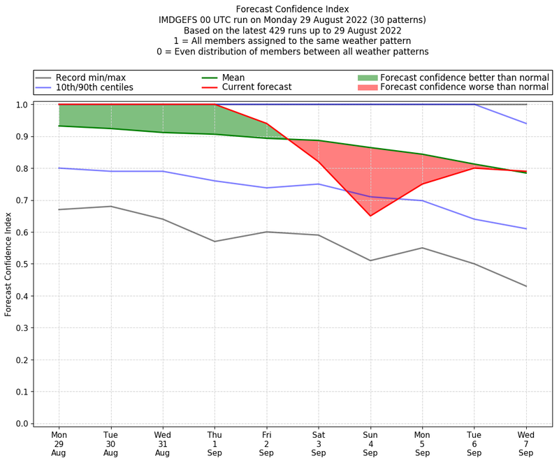 | Weather patterns typically associated with contrywide dry period tendencies over India are most likely Weather patterns 2, 3, 7, 8, 9, 16 and 20 (countrywide winter dry period) | |