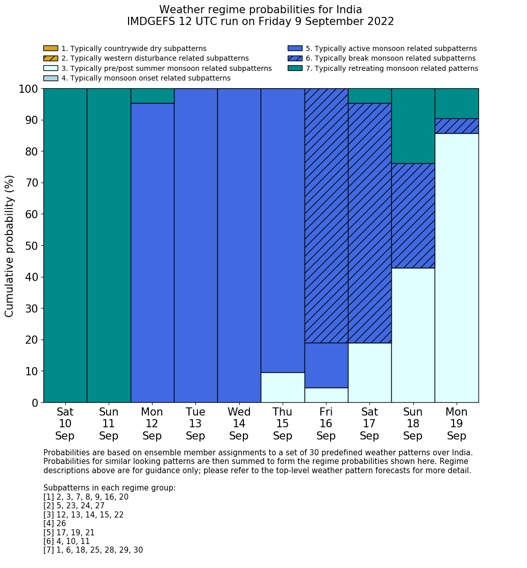 | Weather patterns typically associated with summer monsoon tendencies over India are most likely Weather patterns 12, 13, 15, 15 and 22 (pre/post summer monsoon); 26 (onset); 17, 19 and 21 (active); 4, 10 and 11 (break) | |