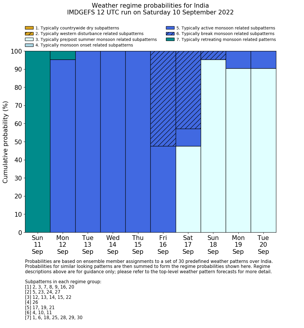 | Weather patterns typically associated with summer monsoon tendencies over India are most likely Weather patterns 12, 13, 15, 15 and 22 (pre/post summer monsoon); 26 (onset); 17, 19 and 21 (active); 4, 10 and 11 (break) | |
