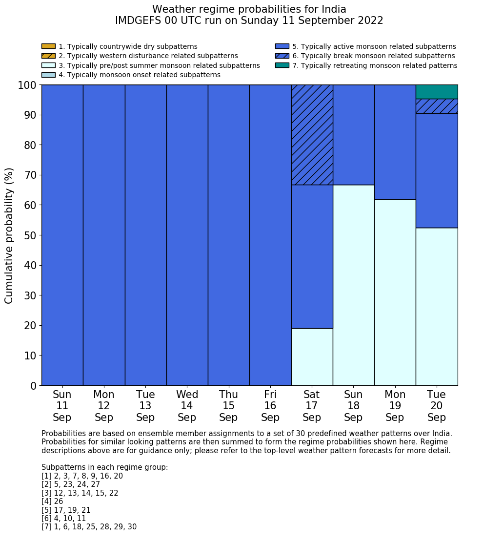 | Weather patterns typically associated with summer monsoon tendencies over India are most likely Weather patterns 12, 13, 15, 15 and 22 (pre/post summer monsoon); 26 (onset); 17, 19 and 21 (active); 4, 10 and 11 (break) | |