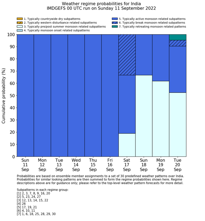 | Weather patterns typically associated with contrywide dry period tendencies over India are most likely Weather patterns 2, 3, 7, 8, 9, 16 and 20 (countrywide winter dry period) | |
