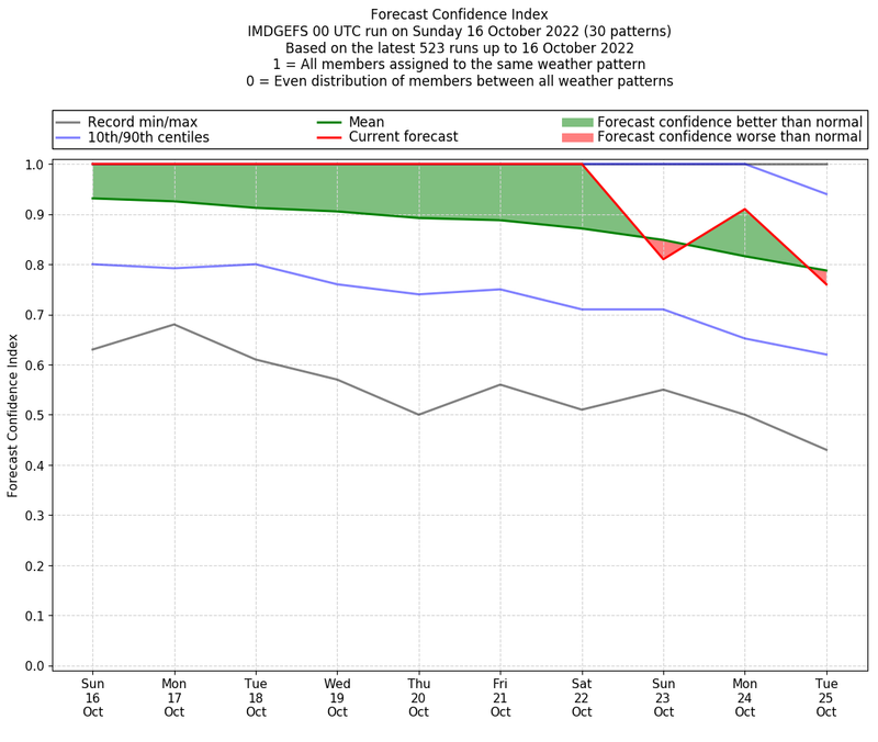 | Weather patterns typically associated with contrywide dry period tendencies over India are most likely Weather patterns 2, 3, 7, 8, 9, 16 and 20 (countrywide winter dry period) | |