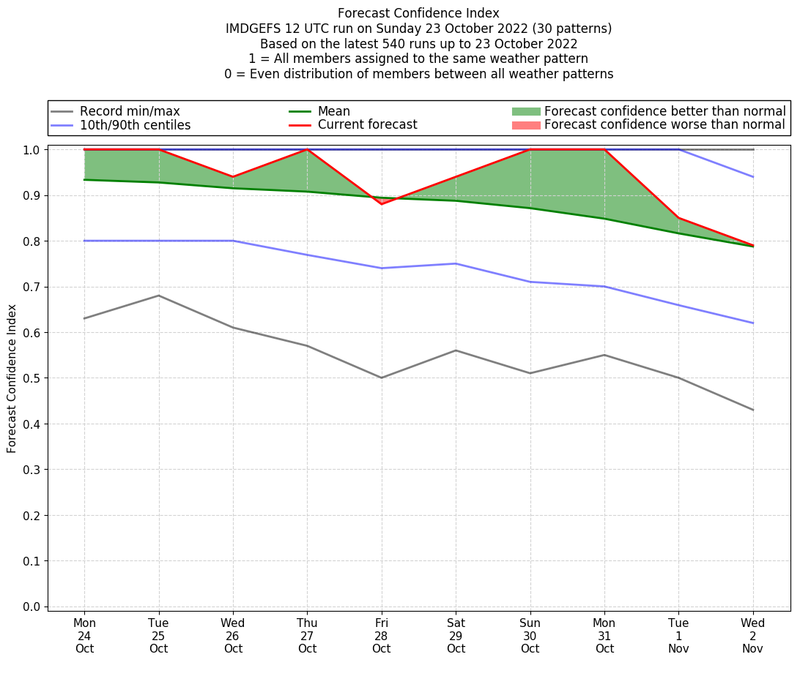 | Weather patterns typically associated with contrywide dry period tendencies over India are most likely Weather patterns 2, 3, 7, 8, 9, 16 and 20 (countrywide winter dry period) | |