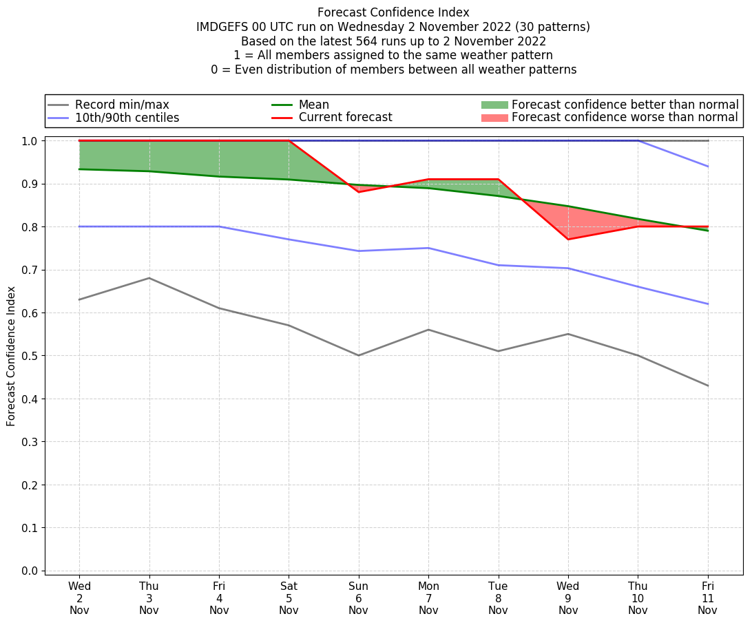 | Weather patterns typically associated with contrywide dry period tendencies over India are most likely Weather patterns 2, 3, 7, 8, 9, 16 and 20 (countrywide winter dry period) | |