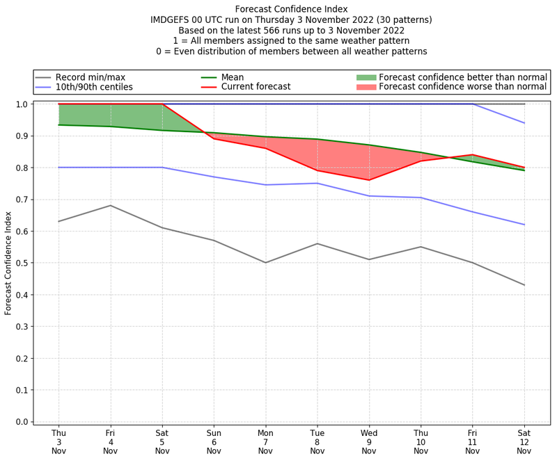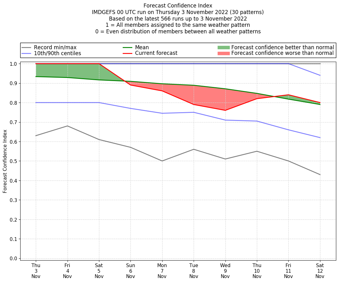 | Weather patterns typically associated with contrywide dry period tendencies over India are most likely Weather patterns 2, 3, 7, 8, 9, 16 and 20 (countrywide winter dry period) | |