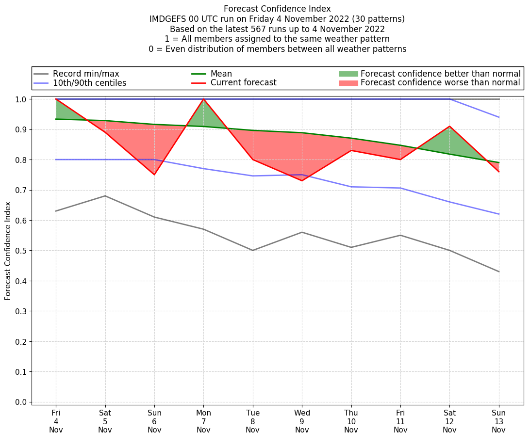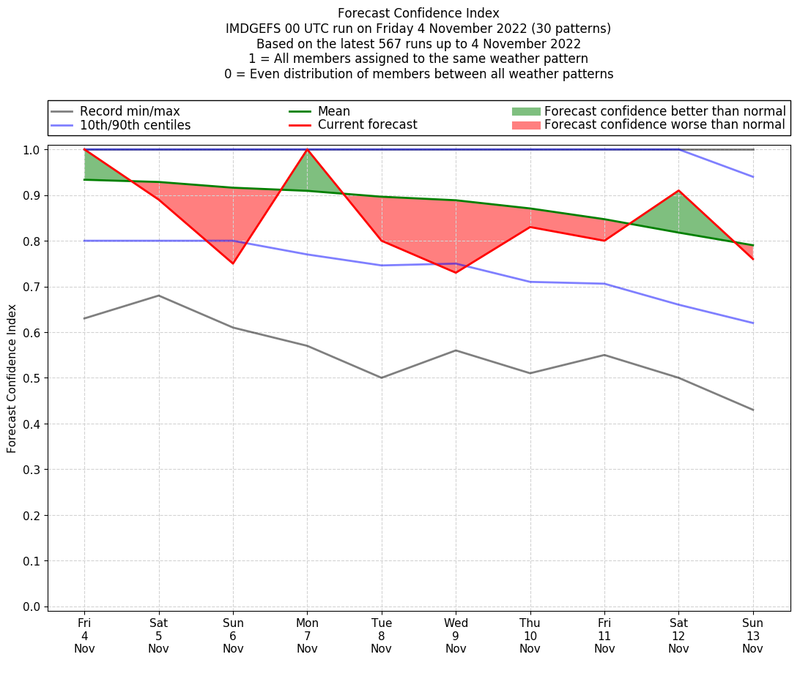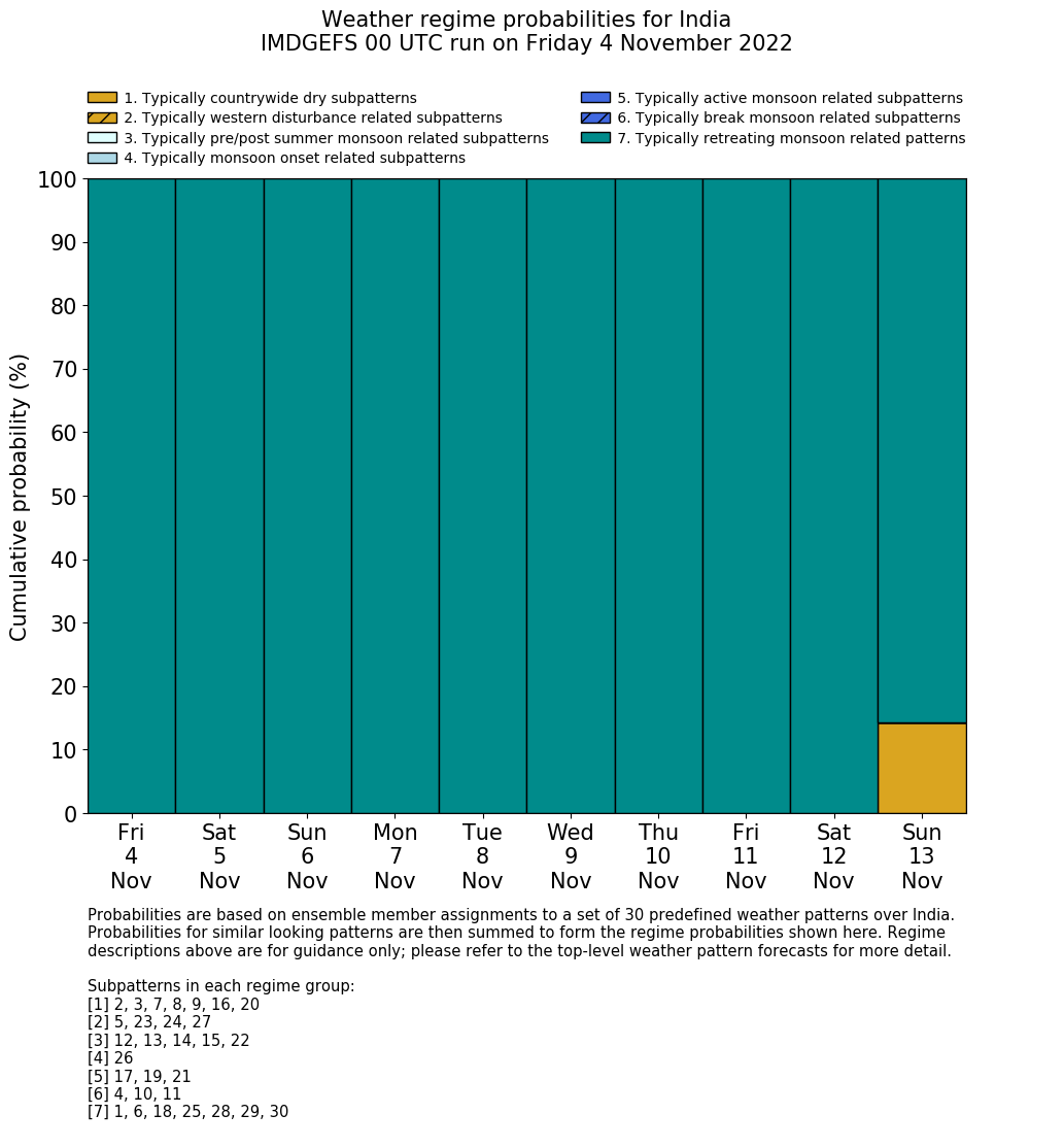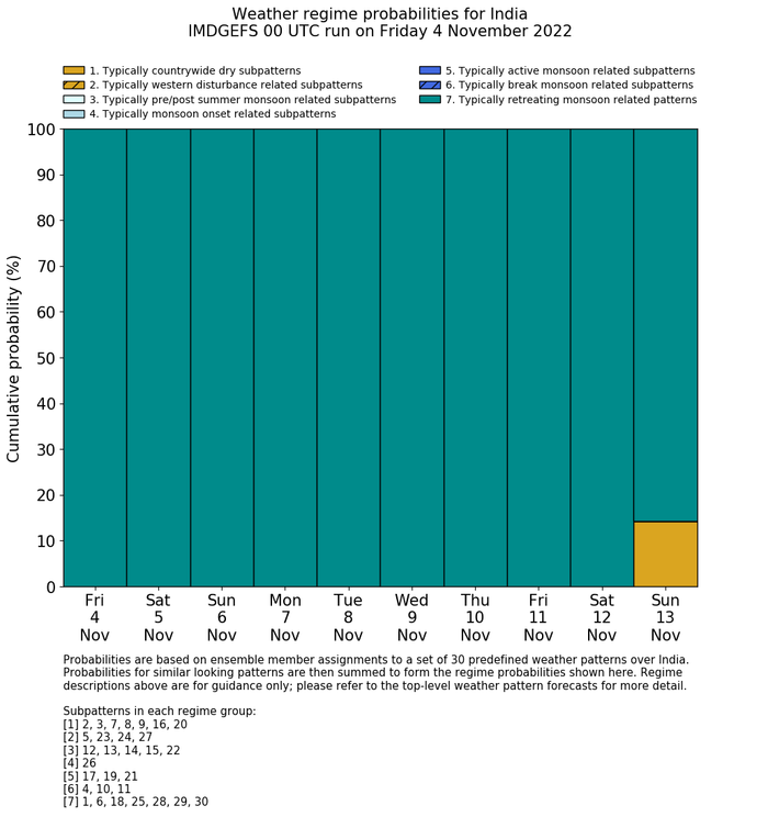 | Weather patterns typically associated with contrywide dry period tendencies over India are most likely Weather patterns 2, 3, 7, 8, 9, 16 and 20 (countrywide winter dry period) | |