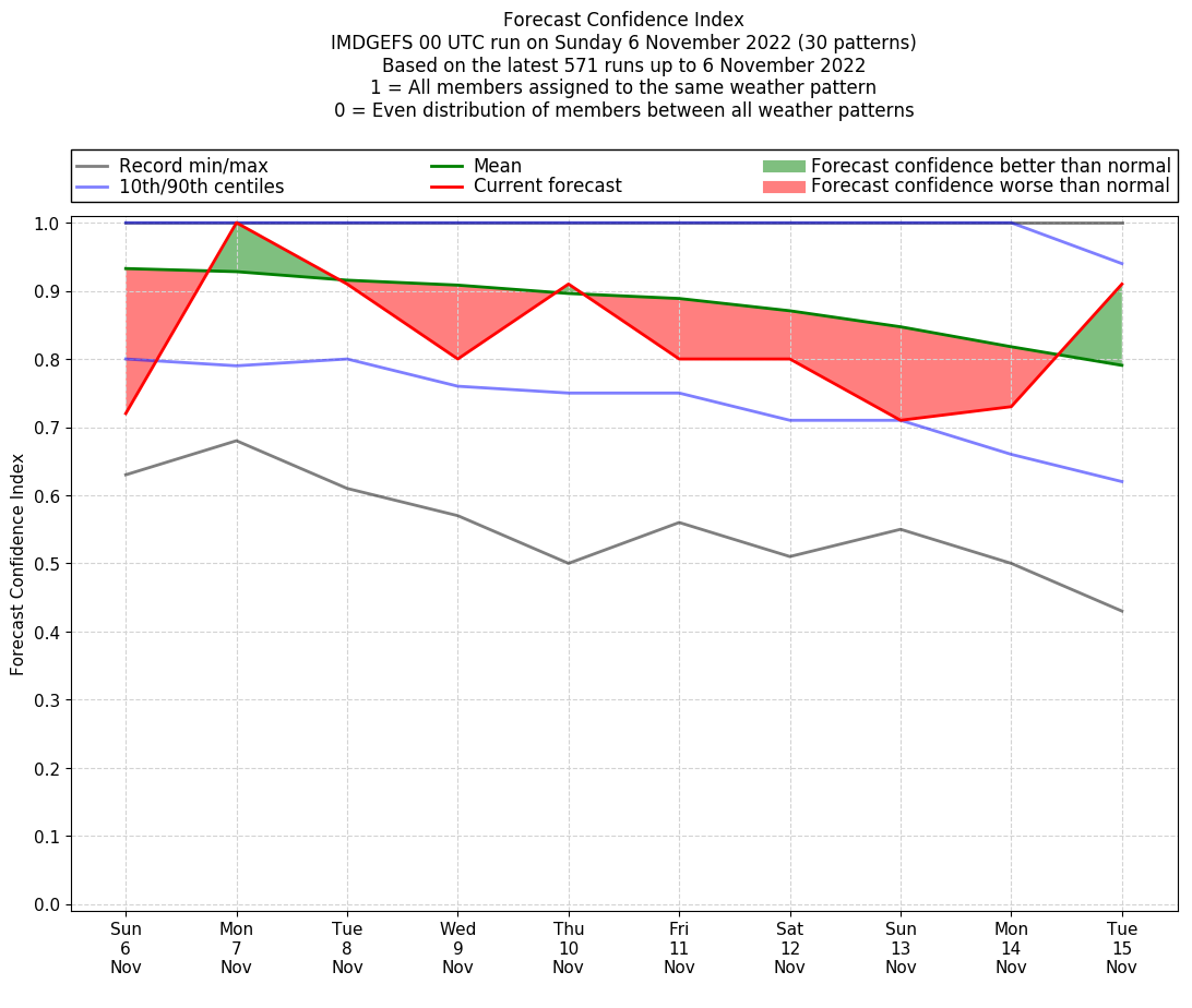 | Weather patterns typically associated with contrywide dry period tendencies over India are most likely Weather patterns 2, 3, 7, 8, 9, 16 and 20 (countrywide winter dry period) | |
