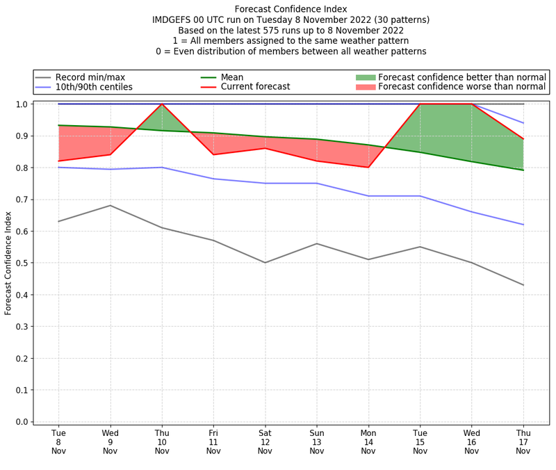 | Weather patterns typically associated with contrywide dry period tendencies over India are most likely Weather patterns 2, 3, 7, 8, 9, 16 and 20 (countrywide winter dry period) | |