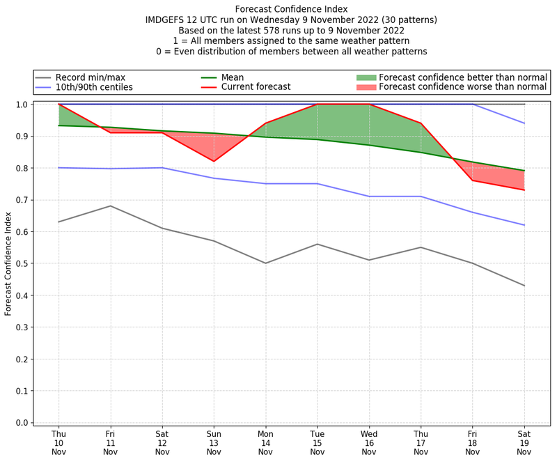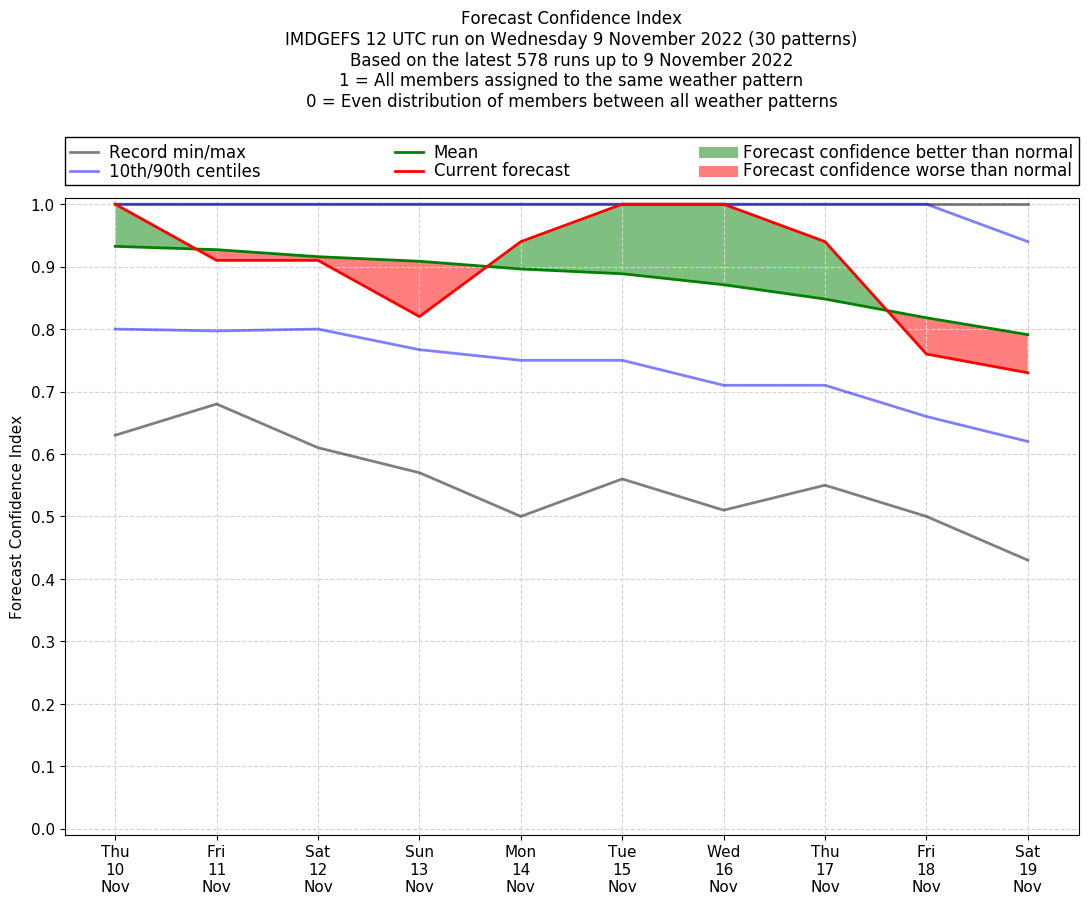 | Weather patterns typically associated with contrywide dry period tendencies over India are most likely Weather patterns 2, 3, 7, 8, 9, 16 and 20 (countrywide winter dry period) | |