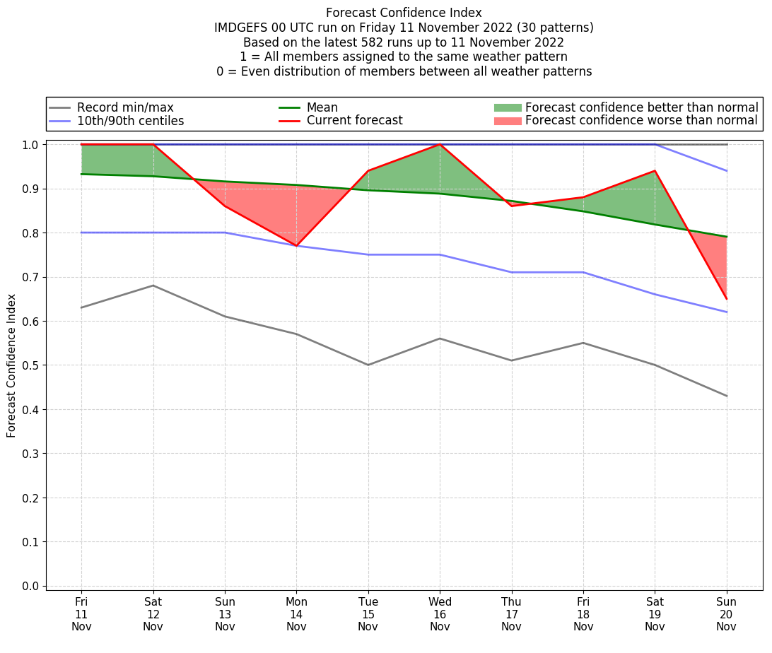 | Weather patterns typically associated with contrywide dry period tendencies over India are most likely Weather patterns 2, 3, 7, 8, 9, 16 and 20 (countrywide winter dry period) | |