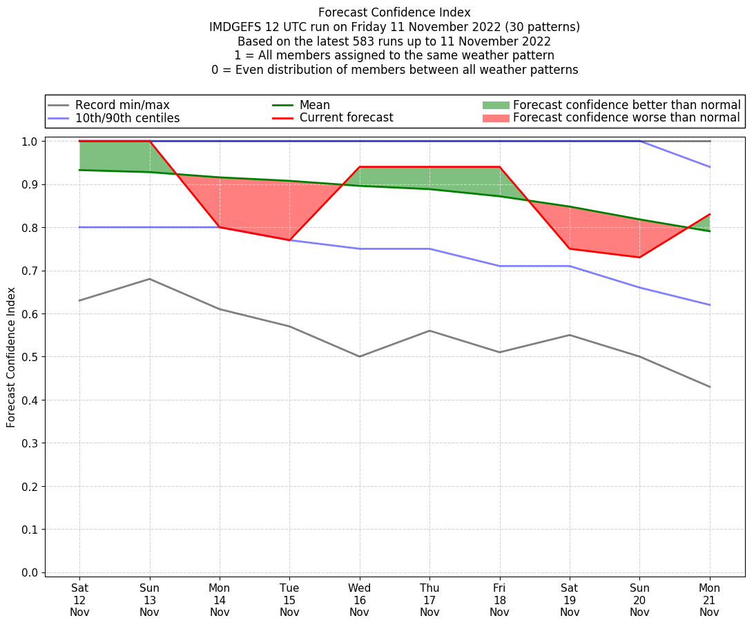 | Weather patterns typically associated with contrywide dry period tendencies over India are most likely Weather patterns 2, 3, 7, 8, 9, 16 and 20 (countrywide winter dry period) | |