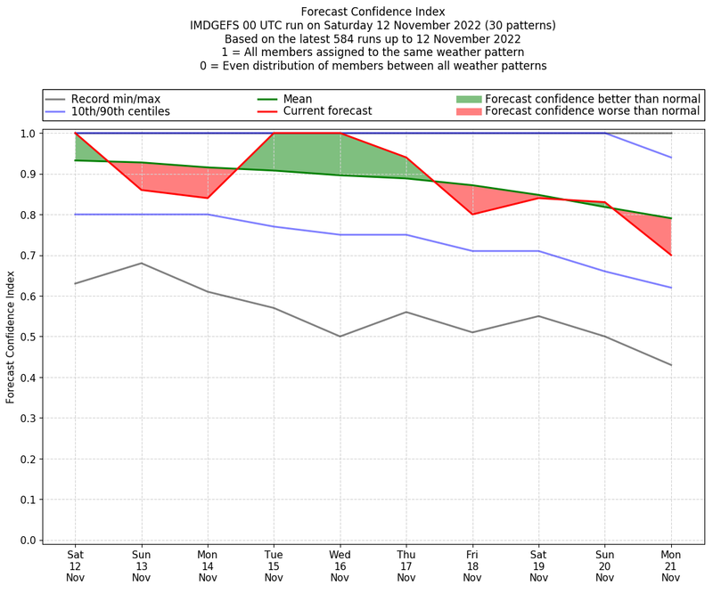 | Weather patterns typically associated with contrywide dry period tendencies over India are most likely Weather patterns 2, 3, 7, 8, 9, 16 and 20 (countrywide winter dry period) | |