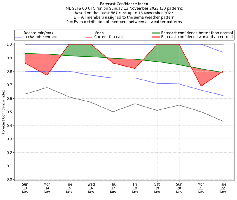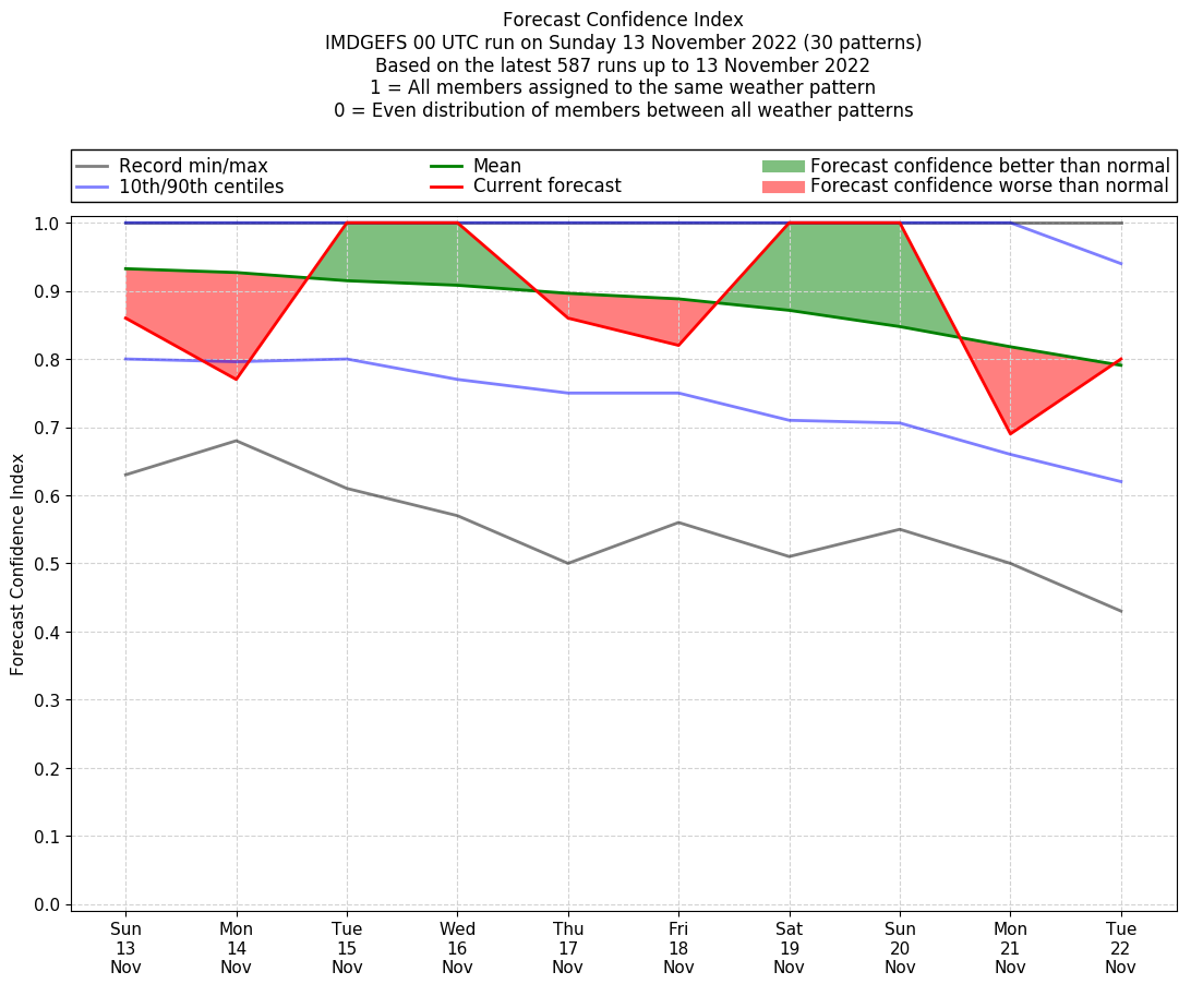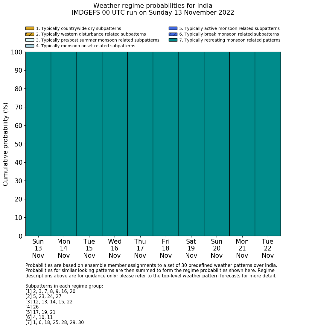 | Weather patterns typically associated with contrywide dry period tendencies over India are most likely Weather patterns 2, 3, 7, 8, 9, 16 and 20 (countrywide winter dry period) | |