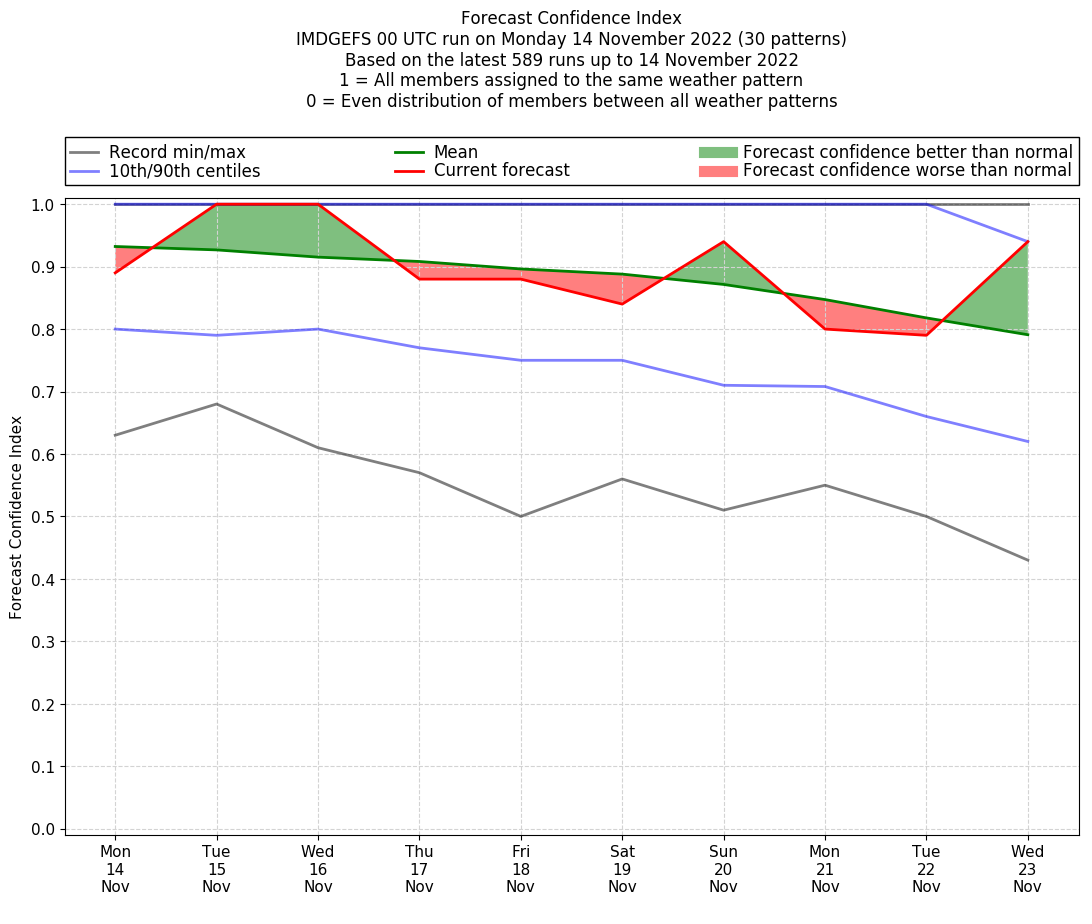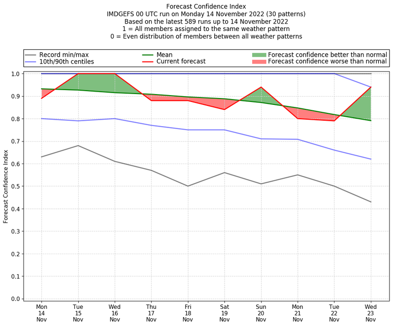 | Weather patterns typically associated with contrywide dry period tendencies over India are most likely Weather patterns 2, 3, 7, 8, 9, 16 and 20 (countrywide winter dry period) | |