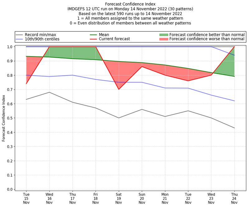 | Weather patterns typically associated with contrywide dry period tendencies over India are most likely Weather patterns 2, 3, 7, 8, 9, 16 and 20 (countrywide winter dry period) | |