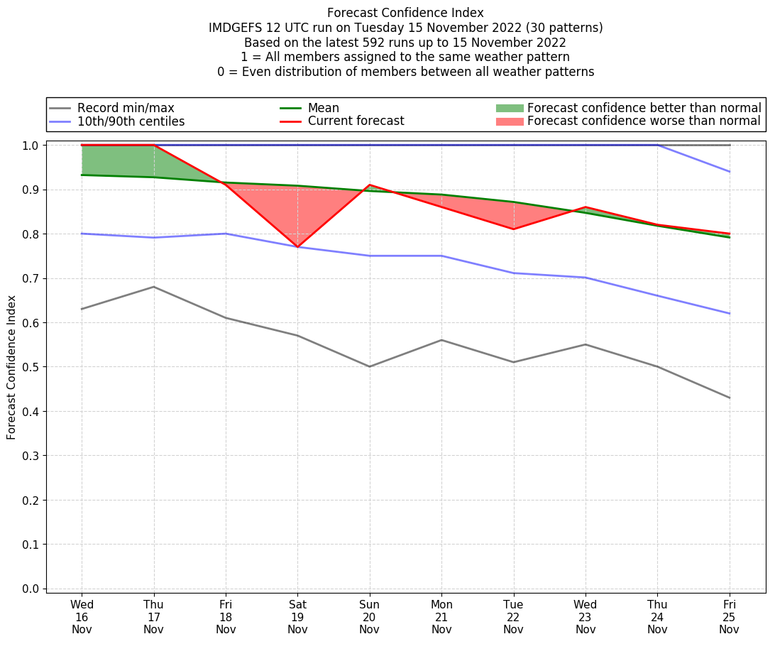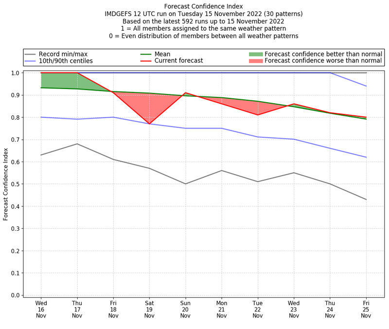 | Weather patterns typically associated with contrywide dry period tendencies over India are most likely Weather patterns 2, 3, 7, 8, 9, 16 and 20 (countrywide winter dry period) | |