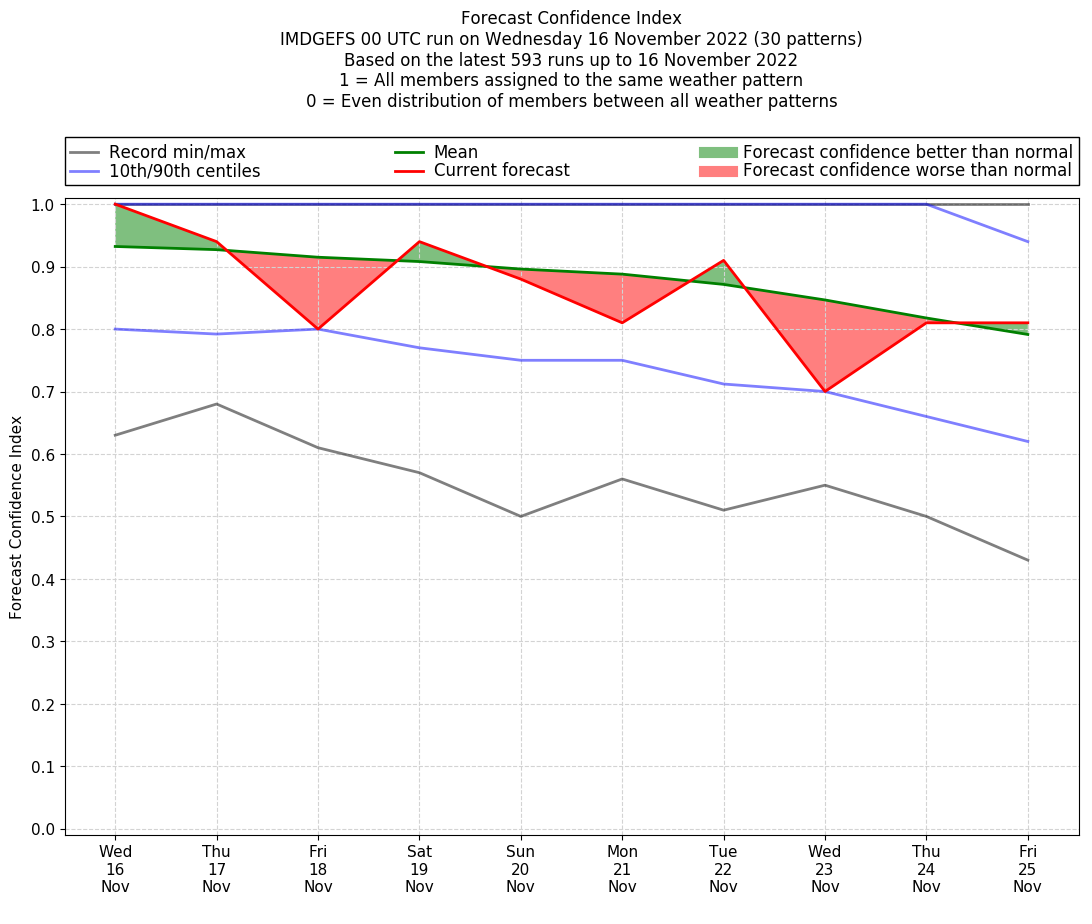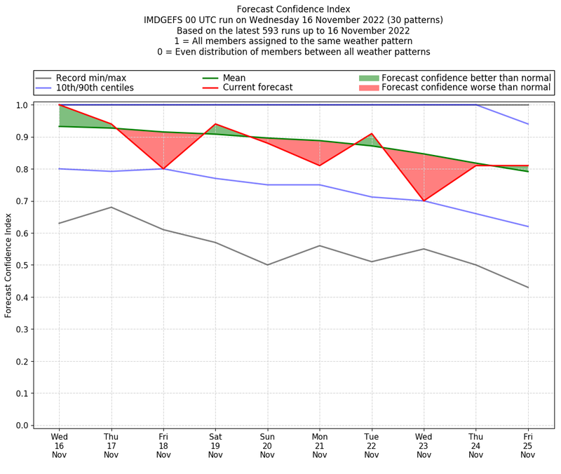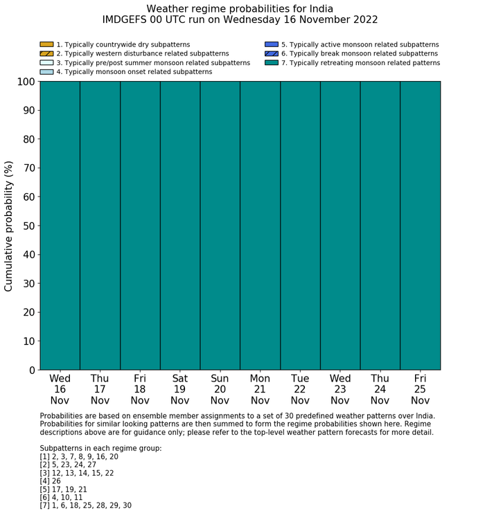 | Weather patterns typically associated with contrywide dry period tendencies over India are most likely Weather patterns 2, 3, 7, 8, 9, 16 and 20 (countrywide winter dry period) | |
