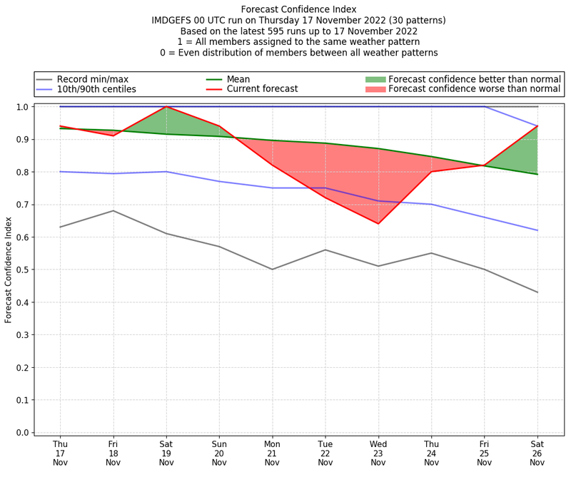 | Weather patterns typically associated with contrywide dry period tendencies over India are most likely Weather patterns 2, 3, 7, 8, 9, 16 and 20 (countrywide winter dry period) | |