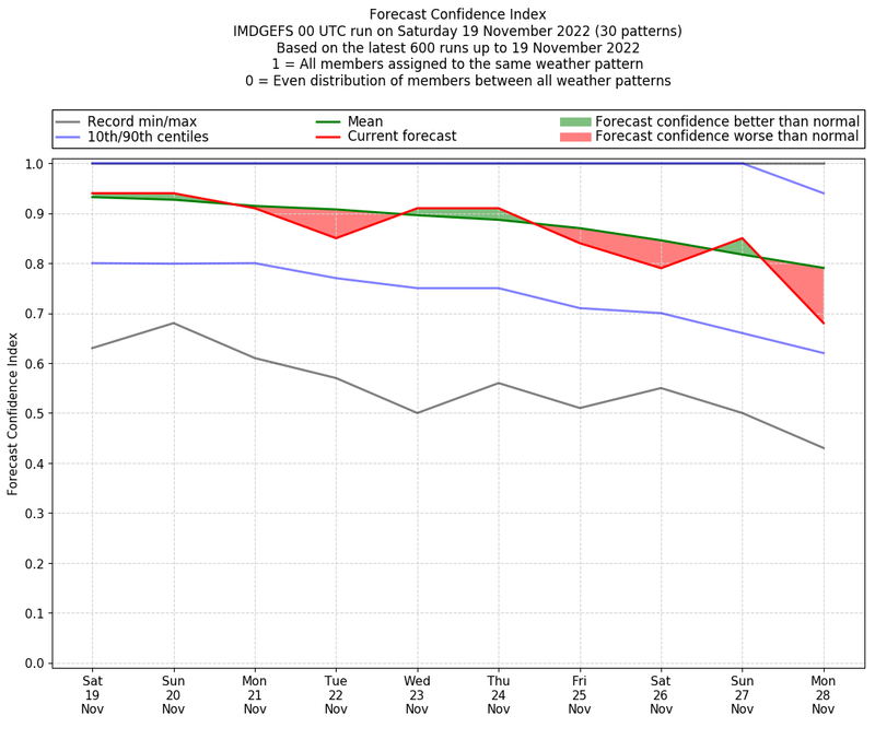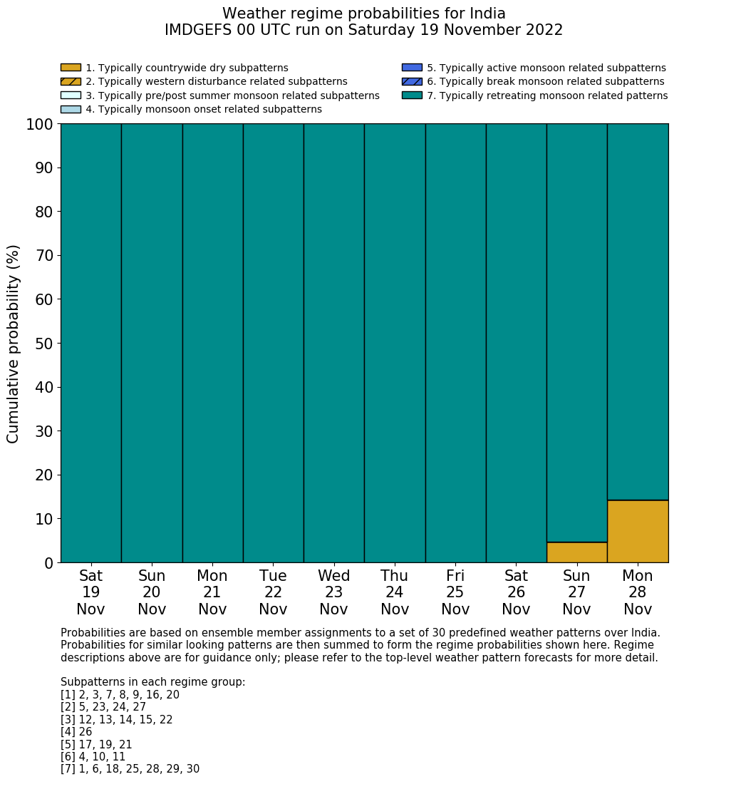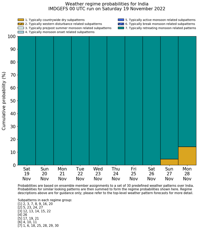 | Weather patterns typically associated with contrywide dry period tendencies over India are most likely Weather patterns 2, 3, 7, 8, 9, 16 and 20 (countrywide winter dry period) | |