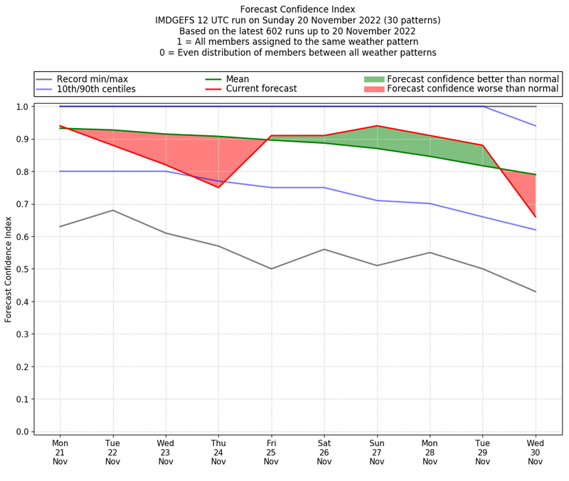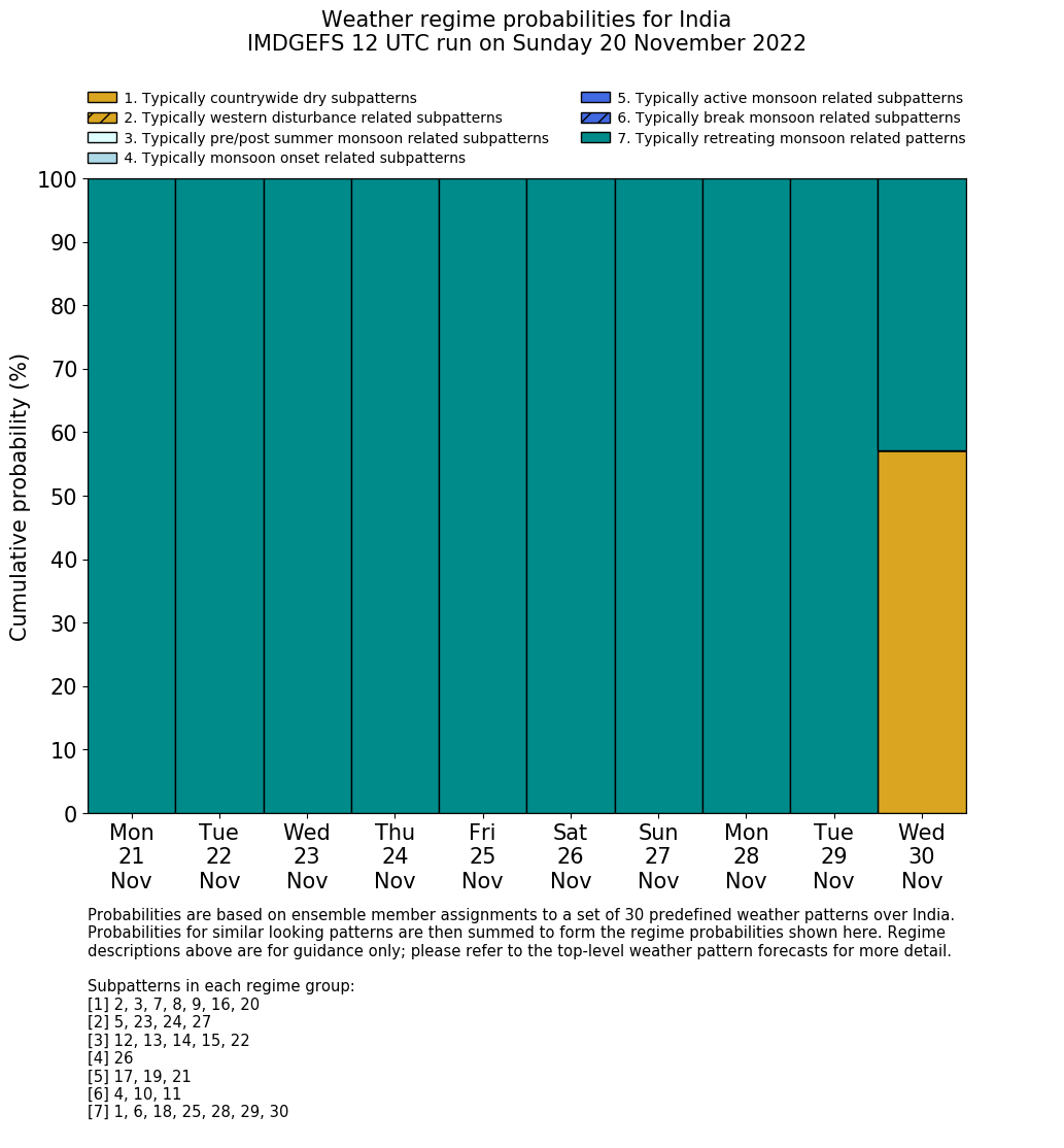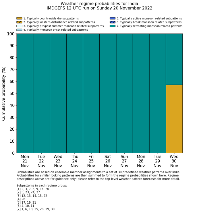 | Weather patterns typically associated with contrywide dry period tendencies over India are most likely Weather patterns 2, 3, 7, 8, 9, 16 and 20 (countrywide winter dry period) | |